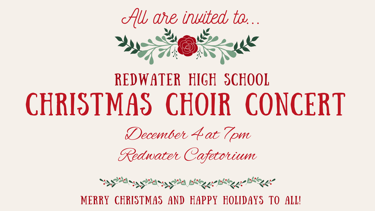 Join us for a festive evening in the Dragon Kingdom! Redwater High School’s Christmas Choir Concert is Thursday, Dec. 4 at 7 PM in the Cafetorium. Enjoy Christmas music and baked goods for sale from the Dragon Theatre Booster Club.
