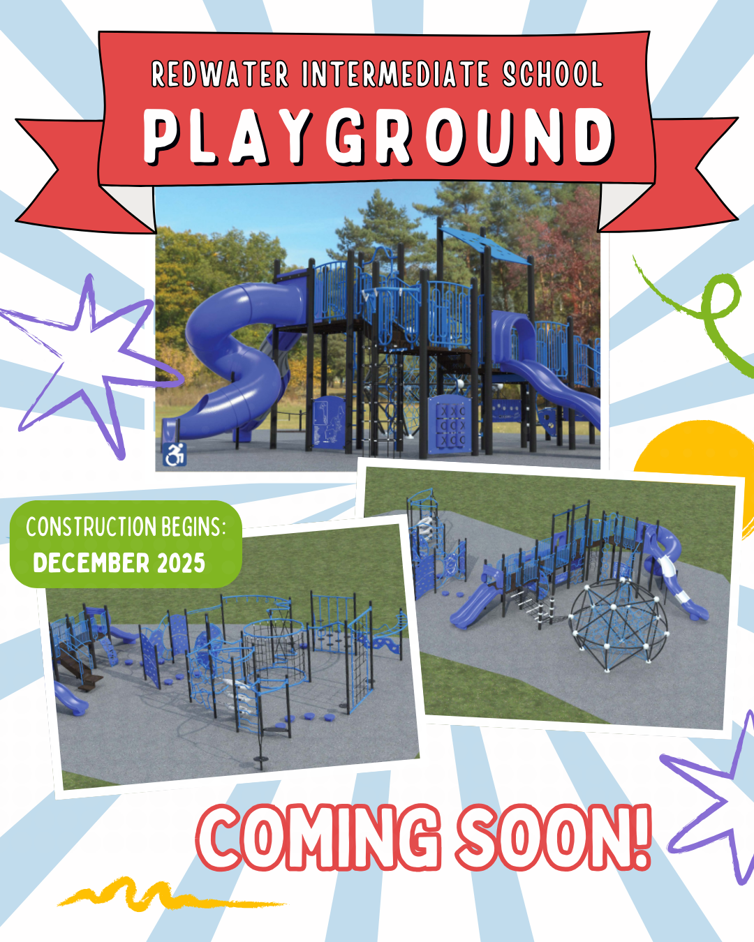We are thrilled to finally share that brand-new playgrounds are officially on the way to Redwater Intermediate and Elementary! Playground construction is expected to start in December 2025.